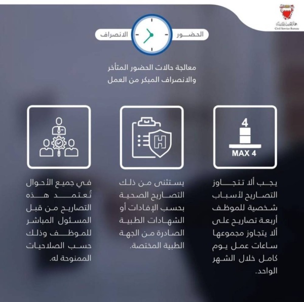 بناءً على قرار مجلس الوزراء الموقر بشأن الموافقة على تطوير سياسة الحضور والانصراف للموظفين الخاضعين لقانون وأنظمة الخدمة المدنية وزيادة المرونة في الحضور والانصراف لتكون بحد أقصى 3 ساعات وفق شروط وضوابط محددة، أصدر أحمد بن زايد الزايد رئيس جهاز الخدمة القرار رقم (1) لسنة 2023 بإصدار تعليمات الخدمة المدنية بشأن نظام الحضور والانصراف في الجهات الحكومية، والتي تهدف إلى وضع قواعد موحدة وعادلة لضبط حضور وانصراف الموظفين العاملين بالجهات الحكومية، وذلك لمصلحة العمل وتحسين وزيادة الإنتاجية وخلق بيئة عمل مريحة وملائمة للموظفين.وأكد الزايد بأن التعليمات توضح الإجراءات والتدابير اللازمة لتطبيق نظام الحضور والانصراف وفقاً لمقتضيات مصلحة العمل، وبما يسهم في تنظيم العمل وتوفير بيانات وتقارير متكاملة تمكن متخذي القرار من متابعة نظام الحضور والانصراف بتلك الجهات بشكل دقيق وشامل.كما ينبغي على الجهات الحكومية إرشاد وتوجيه الموظفين بضرورة الالـتزام بالحضور والانصراف في مواعيد العمل الرسمية المحددة، مع الحفاظ على تقديم الخدمة الحكومية للجمهور بكل سرعة وفعالية وفق مؤشرات قياس الأداء.وأوضح رئيس جهاز الخدمة المدنية أن أوقات العمل الرسمية لنظام ساعات العمل الاعتيادية تكون بمعدل (36) ساعة أسبوعياً من الساعة السابعة صباحاً حتى الساعة الثانية والربع ظهراً من يوم الأحد إلى يوم الأربعاء، ومن الساعة السابعة صباحاً حتى الساعة الثانية ظهراً ليوم الخميس، وفيما يخص أوقات العمل الرسمية لنظام ساعات العمل المطولة بمعدل (40) ساعة أسبوعياً على أن تكون من الساعة السابعة صباحاً حتى الساعة الثالثة ظهراً من يوم الأحد إلى يوم الخميس، ويكون تطبيق نظام الدوام المرن بما لا يتجاوز 3 ساعات مرونة كحد أقصى.كما وبين الزايد أن نظام الحضور والانصراف يطبق على جميع الموظفين وفق شروط وضوابط محددة، ولا تسري أحكام نظام الدوام المرن على الموظفين العاملين وفق نظام النوبات الذين تتطلب وظائفهم العمل على مدار الساعة، والعاملين بنظام العمل الجزئي والوظائف الطبية والتعليمية والحيوية، إلا بعد موافقة جهاز الخدمة المدنية بناءً على المبررات التي تقدمها الجهة الحكومية ووفقاً لما تقتضيه مصلحة العمل في بعض الحالات الخاصة.وأضاف الزايد بأنه يجب على الموظفين إدخال التصاريح المتعلقة بالعمل أو لأسباب شخصية للحضور المتأخر أو الانصراف المبكر مباشرة حال حصول التأخير أو الانصراف المبكر في نظام الحضور والانصراف الآلي أو يدوياً مع بيان أسباب التأخير أو الانصراف المبكر، ويجب ألا تتجاوز التصاريح لأسباب شخصية للموظف أربعة تصاريح على ألا يتجاوز مجموعها ساعات عمل يوم كامل خلال الشهر الواحد، ويستثنى من ذلك التصاريح الصحية بحسب الإفادات أو الشهادات الطبية الصادرة من الجهة الطبية المختصة، وفي جميع الأحوال تُعتمد هذه التصاريح من قبل المسؤول المباشر للموظف وذلك حسب الصلاحيات الممنوحة له.واختتم رئيس جهاز الخدمة المدنية تصريحه بأن تطبيق الدوام المرن في الجهات الحكومية يكون بحسب الاتفاق بين الموظف والمسؤول المباشر شريطة موافقة السلطة المختصة أو من تفوضه وبما يراعي عدم التأثير على العمل بالجهة، وتراعى كذلك الوظائف الحيوية بالجهات الحكومية عند تطبيق الدوام المرن للموظف.للاطلاع على القرار كاملاً.. يرجى زيارة الرابط التالي: