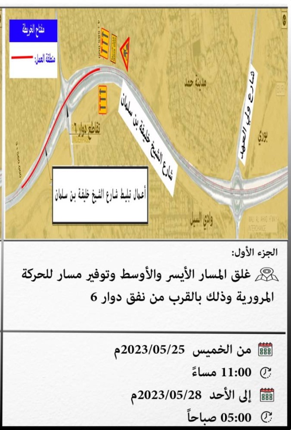 تعلن وزارة الأشغال وبالتنسيق مع الإدارة العامة للمرور بوزارة الداخلية، بأن أعمال إعادة تبليط على شارع الشيخ خليفة بن سلمان تستدعي غلق عدد من المسارات على مراحل وسيتم توفير مسار ومسارين للحركة المرورية باتجاه الجنوب إلى الزلاق كالتالي:- غلق المسار الأيسر والأوسط وتوفير مسار للحركة المرورية وذلك بالقرب من نفق دوار 6، وسيتم العمل في الموقع المذكور ابتداءً من يوم الخميس 25/05/2023م الساعة 11:00 مساءً إلى يوم الأحد 28/05/2023م الساعة 05:00 صباحاً.- غلق المسار الأيسر في الجزء المحصور بين كوبري ولي العهد ونفق دوار 6 وسيتم توفير مسارين للحركة المرورية، حيث سيتم العمل في الموقع المذكور ابتداءً من يوم الأحد 28/05/2023م إلى يوم الخميس 01/06/2023م.يرجى من المواطنين والمقيمين الكرام الالتزام بالقواعد المرورية حفاظاً على سلامة الجميع.