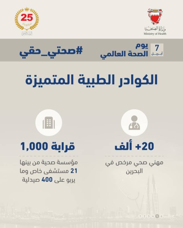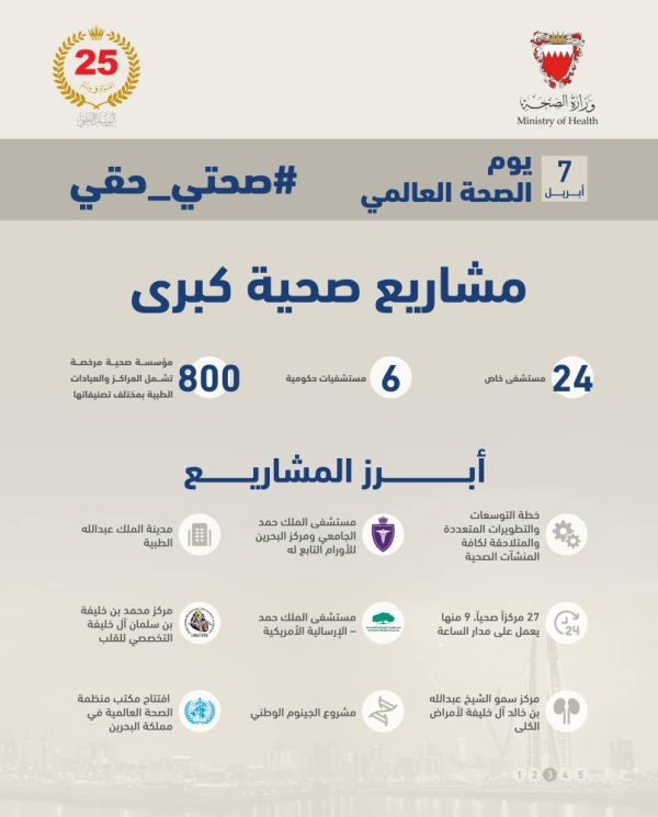 تحتفل مملكة البحرين بيوم الصحة العالمي الذي يصادف 7 أبريل من كل عام، لتسلّط الضوء هذا العام على سجل الإنجازات المتحققة في القطاع الصحي على مدار 25 عاماً، في ظلّ العهد الزاهر لحضرة صاحب الجلالة الملك حمد بن عيسى آل خليفة ملك البلاد المعظم حفظه الله ورعاه، وبدعم صاحب السمو الملكي الأمير سلمان بن حمد آل خليفة ولي العهد رئيس مجلس الوزراء حفظه الله، ولتعكس التزام المملكة بتحسين جودة الخدمات الصحية وتوفير الرعاية الصحية الشاملة للمواطنين والمقيمين.وتزامناً مع الاحتفال باليوبيل الفضي لذكرى مرور 25 عاماً لتولي جلالة الملك مقاليد الحكم، استطاع القطاع الصحي في مملكة البحرين من تحقيق العديد من الإنجازات، كونها منحت (الحق في الصحة) أولوية دائمة في كافة الخطط والاستراتيجيات التنموية، وعملت بجهود متواصلة وحثيثة على تحقيق أهداف التنمية المستدامة وما لحقتها من أهداف ما بعد الألفية، وخصصت موازنات وافرة للقطاع الصحي في كافة الميزانيات، فضلاً عن تخصيص ميزانيات استثنائية لمواجهة التحديات الصحية الطارئة كجائحة فيروس كورونا (كوفيد-1)، وذلك في إطار الحرص على ضمان صحة وسلامة جميع أفراد المجتمع.الحق في الصحةووفقاً لدستور مملكة البحرين في المادة (8): "لكل مواطن الحق في الرعاية الصحية، تعنى الدولة بالصحة العامة وتكفل وسائل الوقاية والعلاج بإنشاء مختلف أنواع المستشفيات والمؤسسات الصحية"، وارتكازاً على ذلك فقد قطعت المملكة خطوات ملموسة في تطوير برنامج الرعاية الصحية، تمهيداً لتطبيق نظام الضمان الصحي، حيث تم تطبيق مبادرة التسيير الذاتي للرعاية الصحية الأولية الهادف لخلق منظومة صحية تقدم خدمات صحية متكاملة ومستدامة، ومسيرة ذاتياً من قبل مجلس أمناء مراكز الرعاية الصحية الأولية وإدارة الصحة الأولية. وتنفيذاً لأمر صاحب السمو الملكي ولي العهد رئيس مجلس الوزراء حفظه الله، فقد تمّ تقديم الخدمات على مدار 24 ساعة في 9 مراكز صحية بمختلف محافظات المملكة بما يسهم في تطوير واستدامة خدمات القطاع الصحي وتعزيز كفاءته تحقيقًا للأهداف المنشودة، مما شكل نقلة نوعية في توفير التغطية الصحية الشاملة على مدار الساعة وبالقرب من المواطنين.وعلى صعيد الرعاية الصحية الأولية، فقد تم إنشاء شبكة من مراكز الرعاية الصحية الأولية، في مناطق مملكة البحرين المختلفة والتي يبلغ عددها اليوم 27 مركزاً صحياً موزعين جغرافياً على مواقع يسهل الوصول لها، وجاري العمل على التوسع فيها تلبية لاحتياجات السكان.مشاريعٌ صحية كبرىوأولت مملكة البحرين حرصاً كبيراً على تحقيق التغطية الصحية الشاملة من خلال مضاعفة المنشآت الصحية بمختلف أنواعها مع ارتفاع عدد المستشفيات العامة، حيث دخل قطاع المستشفيات فصلاً جديداً مع افتتاح مستشفى الملك حمد الجامعي والذي يعمل جنباً إلى جنب مع مجمع السلمانية الطبي ومستشفى قوة دفاع البحرين (المستشفى العسكري) في تقديم كافة الخدمات الطبية المتطورة وفق المعايير العالمية.ولقد فتح العهد الزاهر لجلالة الملك المعظّم أيّده الله، الفضاء واسعاً لتعزيز الشراكة مع القطاع الخاص في تقديم الخدمات الصحية من خلال تشجيع الاستثمارات الطبية ووضع اللوائح المنظمة ومعايير الجودة المنظمة، وكانت ثمرة ذلك وصول عدد المستشفيات الخاصة إلى 21 مستشفى مقابل 6 مستشفيات حكومية، فيما تجاوز إجمالي المؤسسات الصحية الخاصة 800 مؤسسة مرخصة تشمل المراكز والعيادات الطبية بمختلف تصنيفاتها.وشهدت المملكة طفرة نوعية في تحقيق التغطية الصحية الشاملة من خلال مشاريع استراتيجية جسدت أهداف ومنطلقات العهد الزاهر، أبرزها: مشروع (خطة التوسع والتطوير المتعددة والمتلاحقة لكافة المنشآت الصحية) وفي مقدمتها مجمع السلمانية الطبي ومستشفى قوة دفاع البحرين، ومشروع (مستشفى الملك حمد الجامعي ومركز البحرين للأورام التابع له) أحد أهم الصروح الطبية الرائدة في مملكة البحرين، ومشروع (مدينة الملك عبدالله الطبية)، إلى جانب إنشاء العديد من المراكز الصحي
