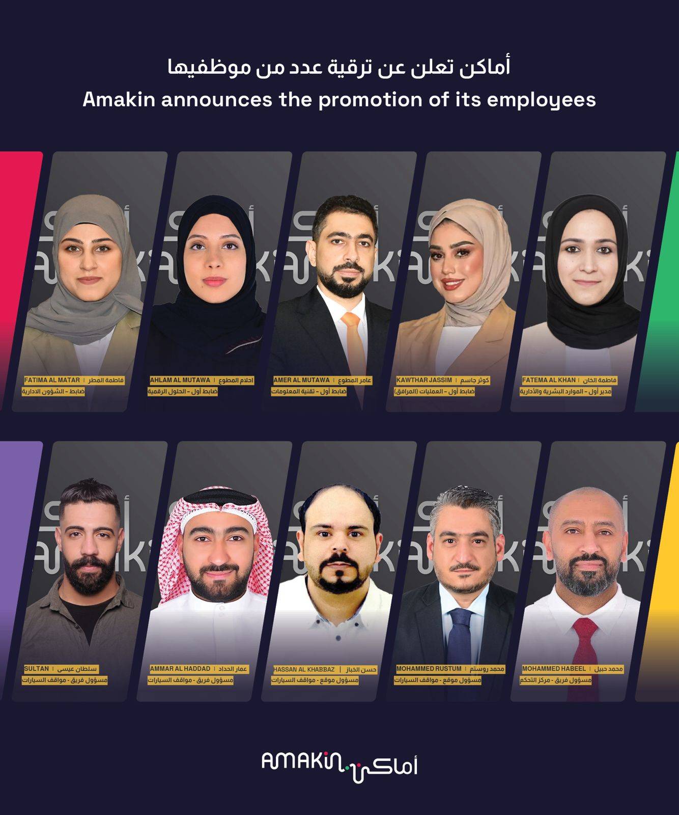 أعلنت شركة البحرين لمواقف السيارات (أماكن) ش.م.ب، الشركة الرائدة والمتميزة في مجال خدمات التنقل وإدارة المواقف، عن ترقيتها لعدد من الموظفين البحرينيين من كلا الجنسين عبر مختلف الأقسام والتخصصات.