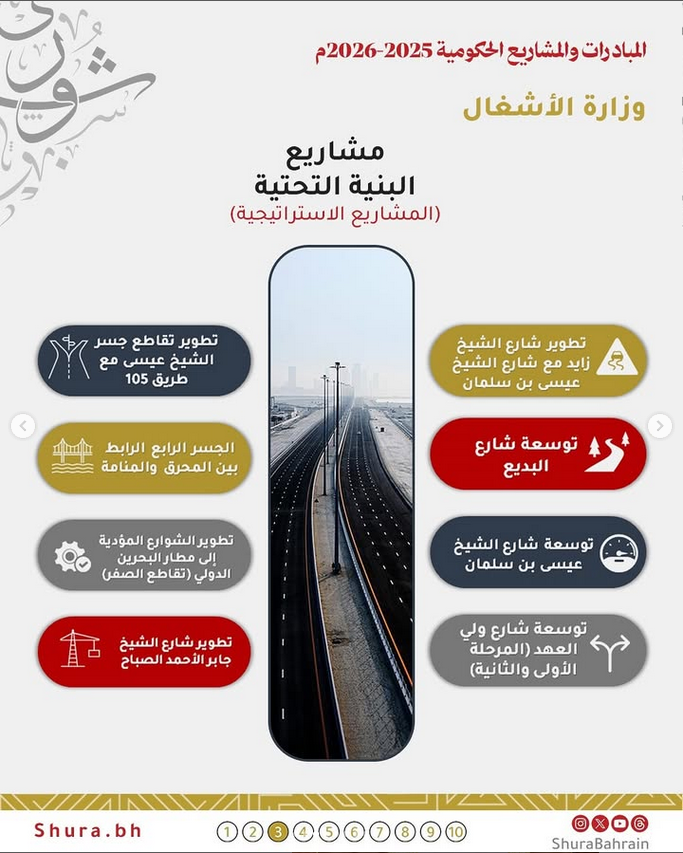 تتضمن الخطط الجديدة ثمانية مشاريع استراتيجية لتطوير الطرق والجسور الرئيسية بالمملكة، من بينها توسعة شارع البديّع، وشارع الشيخ عيسى بن سلمان، وشارع ولي العهد (المرحلتين الأولى والثانية). كذلك سيتم إنشاء الجسر الرابع الرابط بين المحرق والمنامة، وتطوير الطرق المؤدية إلى مطار البحرين الدولي عبر تقاطع الصقر، بالإضافة إلى تحسين شارع الشيخ جابر الأحمد الصباح وشارع الشيخ زايد مع شارع الشيخ عيسى بن سلمان، وأخيرًا تطوير تقاطع جسر الشيخ عيسى مع طريق 105.