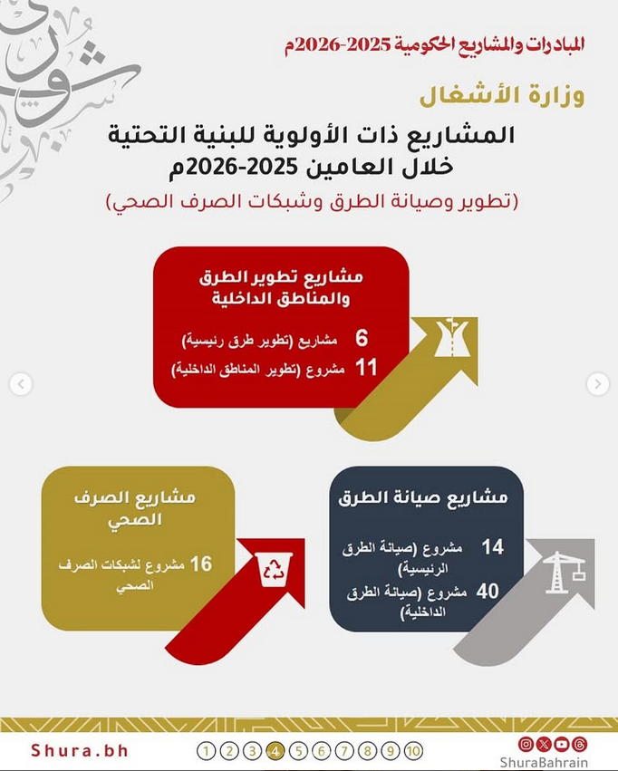 وفيما يخص أولويات مشاريع الطرق، أعلنت الحكومة عن خطط لتطوير 6 شوارع رئيسية بطول 10.5 كيلومتر، إضافة إلى تنفيذ 11 مشروعاً لتحسين طرق وشوارع داخلية بمسافة إجمالية تصل إلى 21.2 كيلومتر. كما ستشمل الجهود صيانة 14 طريقاً رئيسياً بطول إجمالي 375 كيلومتراً، فضلاً عن تنفيذ 40 مشروعاً لصيانة الطرق الداخلية بمسافة تصل إلى 330 كيلومتر. وفي قطاع الصرف الصحي، تتضمن خطط البنية التحتية تنفيذ 16 مشروعاً لإنشاء شبكات جديدة، سيُستفاد منها في تقديم حوالي 5,242 توصيلة جديدة للمنازل والعقارات. وأوضحت الحكومة أن عدد العقارات المتصلة بشبكة الصرف الصحي ارتفع من 273,058 في عام 2020 إلى حوالي 280,411 مع نهاية عام 2024.