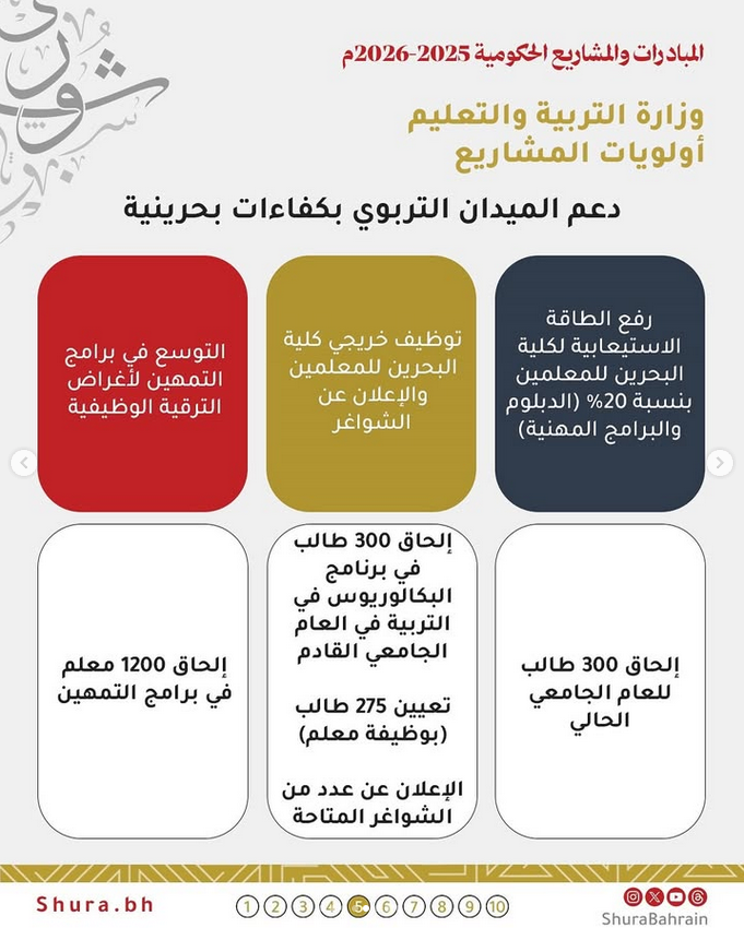 ولدى وزارة شؤون البلديات والزراعة وائل المبارك خطة لإنشاء وإعادة تأهيل 46 حديقة وممشى، وتطوير 6 سواحل عامة، و6 أسواق، وإنشاء 5 مشاريع تجارية بالشراكة مع القطاع الخاص، كما لدى وزارة التربية والتعليم خطة لإنشاء 3 مدارس هذا العام، ومدرستين العام المقبل، وإنشاء مبنيين أكاديميين هذا العام، ومثلهما العام المقبل وصيانة 80 مدرسة، والتوسع في صفوف الدمج بعدد 13 صفاً إضافياً، واستقطاب عدد من الكفاءات البحرينية الحاصلة على مؤهل تخصص التربية الخاصة.