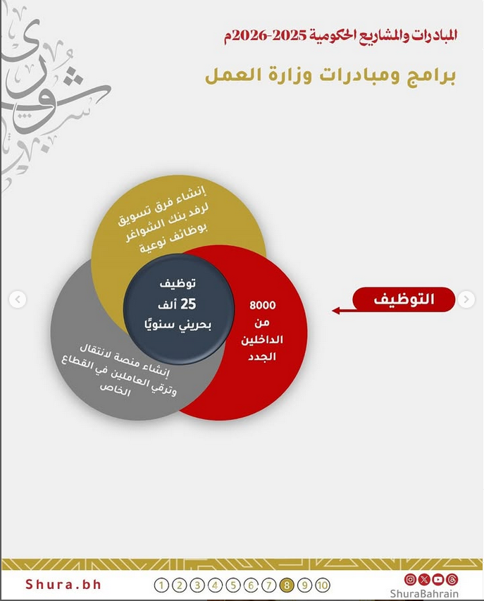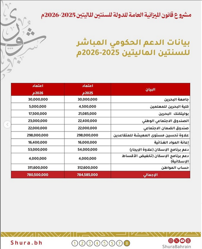 وفي سياق المبادرات الجديدة، تم استحداث حساب خاص ضمن بنود الدعم الحكومي المباشر تحت مسمى «حساب المواطن»، حيث خُصص له مبلغ 312 مليوناً و600 ألف دينار للعام 2025، و311 مليوناً و600 ألف دينار للعام 2026. وشهدت مخصصات علاوة تحسين مستوى المعيشة بالميزانية زيادة كبيرة بقيمة 241 مليون دينار مقارنة بالدورة السابقة. حيث بلغ إجمالي المبالغ المرصودة لهذا الغرض خلال الدورة الحالية 596 مليون دينار. أما في باب الدعم المباشر، فقد تم تخصيص 107 ملايين دينار لعلاوة الإسكان، و32 مليوناً و400 ألف دينار لدعم الإعانات الغذائية، و44 مليون دينار للضمان الاجتماعي. كما خصصت الميزانية مبالغ لدعم التعليم، تضمنت 60 مليون دينار لجامعة البحرين، و9.5 مليون دينار لكلية البحرين للمعلمين، بالإضافة إلى 38 مليوناً و585 ألف دينار لـ»بوليتكنيك البحرين». ومن جهة أخرى، تم رصد 45 مليوناً و400 ألف دينار للصندوق الاجتماعي الوطني، و8 ملايين دينار لتخفيض الأقساط الإسكانية.