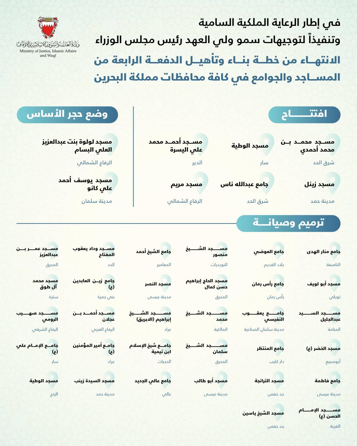 في ظل الرعاية الملكية السامية من حضرة صاحب الجلالة الملك حمد بن عيسى آل خليفة ملك البلاد المعظم حفظه الله ورعاه، وتنفيذاً لأمر صاحب السمو الملكي الأمير سلمان بن حمد آل خليفة ولي العهد رئيس مجلس الوزراء حفظه الله، أعلنت وزارة العدل والشؤون الإسلامية والأوقاف، عن الانتهاء من افتتاح وترميم وتأهيل 40 مسجدًا تابعًا لإدارتي الأوقاف السنية والجعفرية، في كافة محافظات مملكة البحرين.