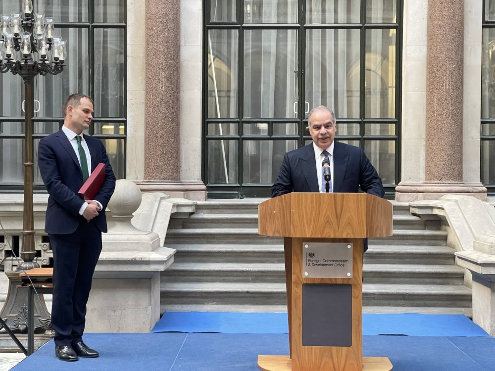 وبهذه المناسبة، ألقى الشيخ فواز بن محمد آل خليفة كلمة أعرب فيها عن جزيل شكره وامتنانه على جهود وزارة الخارجية البريطانية والقائمين عليها في استضافة الحفل بحضور لفيف من سفراء ودبلوماسيي الدول الإسلامية العربية والأجنبية الصديقة، منوهًا بما تمثله المملكة المتحدة من مثال على التعايش الديني وما شهده شهر رمضان من هذا العام من فعاليات ومآدب إفطار كان من أبرزها مأدبة الإفطار في قلعة وندسور برعاية كريمة من جلالة الملك تشارلز الثالث، والإفطار الذي تلاه في قاعة وستمنستر في البرلمان نظمته مجموعة أصدقاء المسلمين في البرلمان البريطاني بحضور رئيس الوزراء ورئيس مجلس العموم.