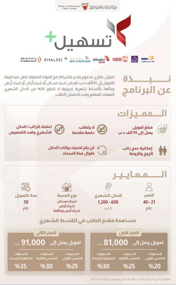 وبينت الوزيرة أن البنوك المشاركة في تمويل برنامج "تسهيل +"، هي بنك البحرين الوطني، وبنك البحرين والكويت، وبنك السلام، وبنك البحرين الإسلامي، وبنك خليجي، وبنك البركة، بالإضافة إلى البنك الأهلي المتحد، مشيرة إلى أن البنوك المشاركة ستقوم بتزويد المواطنين بالمبالغ التمويلية، فيما ستقوم وزارة الإسكان والتخطيط العمراني بسداد الدعم الحكومي كمقدم للبنك الممول، بالإضافة إلى سداد قيمة الفارق بين قيمة القسط الفعلي للخدمة التمويلية وبين القيمة المستقطعة من قبل المواطن كدعم حكومي بشكل شهري.