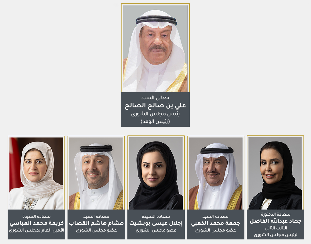 ويضم وفد مجلس الشورى، كلًا من أصحاب السعادة: الدكتورة جهاد عبدالله الفاضل، النائب الثاني لرئيس المجلس، السيد جمعة محمد الكعبي، السيدة إجلال عيسى بوبشيت، السيد هشام هاشم القصاب، أعضاء المجلس، والسيدة كريمة محمد العباسي، الأمين العام للمجلس.