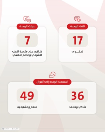 وفيما يتعلق بما أنجزته الوحدة خلال الفترة ذاتها؛ فقد انتهت الوحدة من تحقيقاتها في إحدى الشكاوى المدعى فيها بإساءة المعاملة إلى إحالة من نسب إليه الاتهام لإدارة المحاكم العسكرية بوزارة الداخلية لتوقيع الجزاء التأديبي المناسب، نظير ما ثبت من تجاوزات قانونية تستوجب المساءلة، وذلك ضمن الصلاحيات الممنوحة للوحدة وفقاً لقرار إنشائها وتعليمات أعمالها.