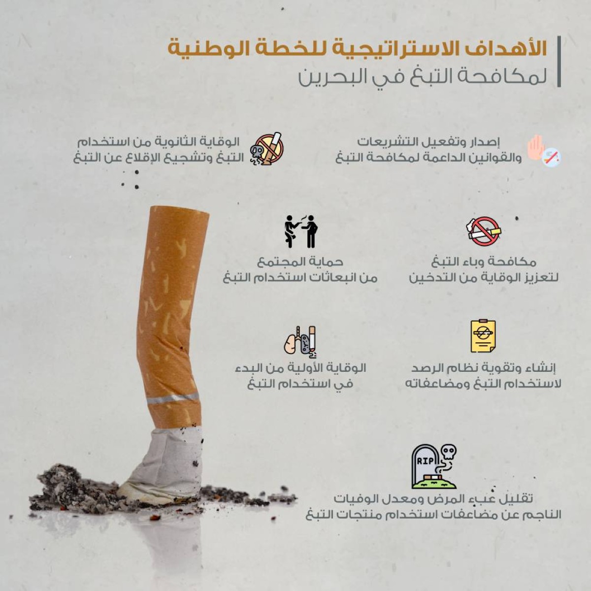 وأولت مملكة البحرين أهمية بالغة لمكافحة آفة التبغ، وذلك من خلال إنشاء اللجنة الوطنية لمكافحة التدخين والتبغ، والتي تتولى إعداد الخطط الطموحة على مستوى كافة الجهات الحكومية والخاصة والأهلية لمواصلة السير قدماً تجاه تفعيل أهداف الشراكة المجتمعية وتعزيز الدور التوعوي والتثقيفي اللازم في أوساط المجتمع حول مخاطر ومضاعفات التدخين وجدوى الإقلاع عنه حفاظاً على الصحة العامة والمجتمع والتنمية.